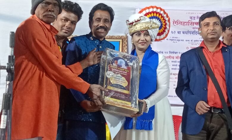 संग्रामपुर [प्रतिनिधी ] देहूरोड बुध्द विहार कृती समिती पुणे येथे राज्यस्तरिय गीत गायन स्पर्धेचे आयोजन करण्यात आले होते गीत गायन स्पर्धेत राज्यभरातील शाहिर सहभागी झाले होते संग्रामपुर तालुक्यातील सुप्रसिध्द शाहिर भगवान शिरसाट व ढोलकी वादक श्रीकृष्ण हातेकर यांनी या राज्यस्तरिय गीत गायन स्पर्धेत सहभाग घेतला होता भीम शाहिर भगवान शिरसाट व ढोलकी वादक शाहिर श्रीकृष्ण हातेकर यांचा सिमाताई पाटील यांच्या हस्ते सन्मानचिन्ह सन्मान करण्यात आला बुद्ध विहार कृती समिती धम्मभूमी देहूरोड पुणे येथे २४ डिसेंबर रोजी राज्यस्तरीय गीत गायन स्पर्धेत ढोलकी वादक श्रीकृष्ण हातेकर यांनी उत्कृष्ठ ढोलकी वाजवली तर भीम शाहीर भगवान शिरसाट यांनी भीम गीत सादर केल्या बद्दल दोघांना विविध क्षेत्रातील मान्यवरांच्या उपस्थितीत सिमाताई पाटील यांच्या हस्ते सन्मानचिन्ह पारोतोषिक देऊन सन्मानीत केले संग्रामपुर तालुका विशेष ग्रामीण भागाचे नाव उज्वल केल्या बद्दल भीम शाहिर भगवान शिरसाट व शाहिर तथा ढोलकी वादक श्रीकृष्ण हातेकर यांचे कलावंत सह सर्व स्तरावरून कौतुक होत आहे
