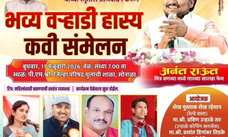 सोनाळ्यात जिल्हा परिषद हायस्कुल प्रांगणात भव्य वऱ्हाडी हास्य कवी संमेलन ! ११ फेब्रुवारी सायंकाळी ७ वाजता